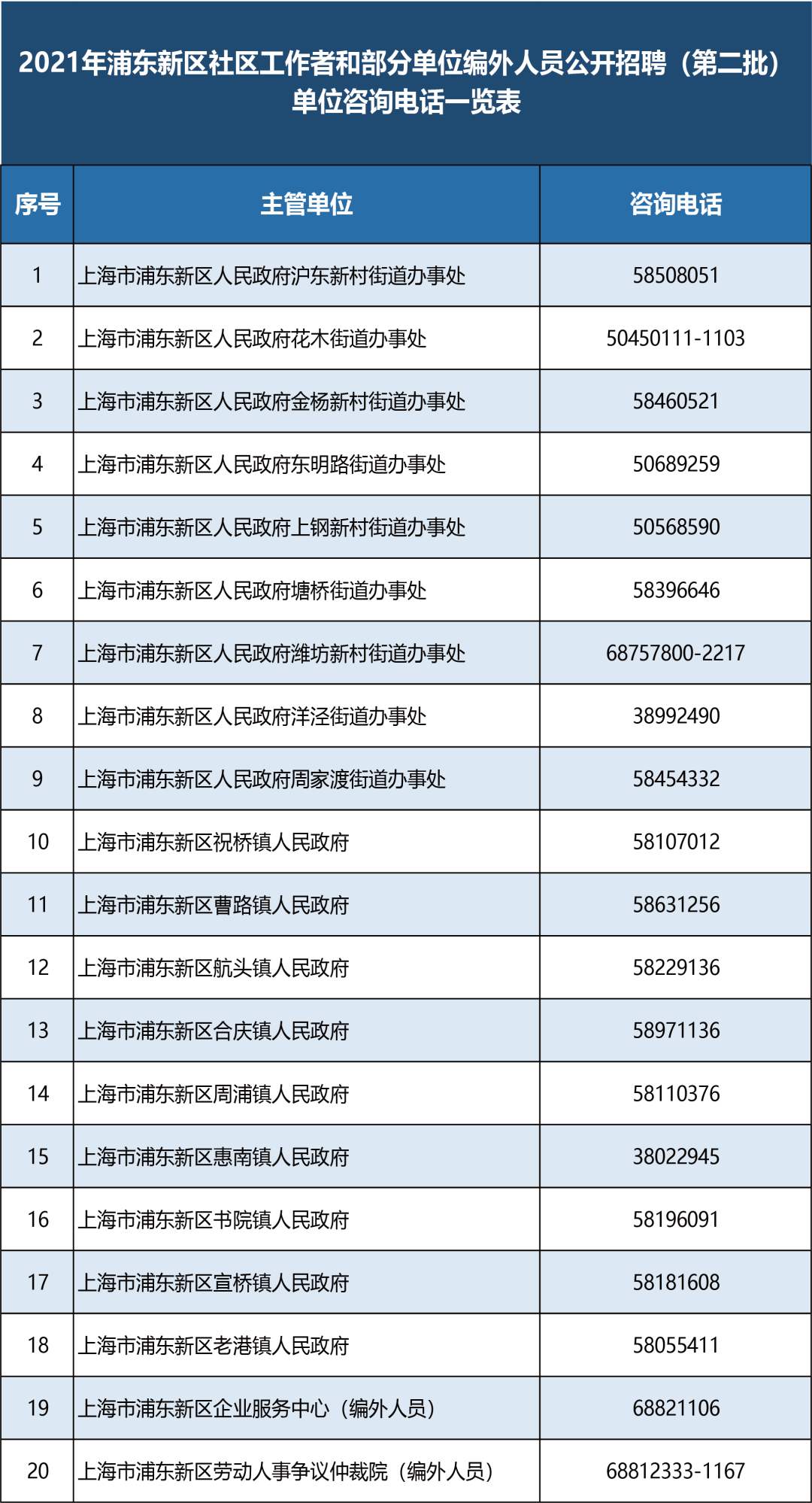 报考人员需要咨询岗位条件、资格审查、面试等相关内容,请直接联系招聘单位,咨询电话详见《2021年浦东新区社区工作者和部分单位编外人员公开招聘(第二批)单位咨询电话一览表》。