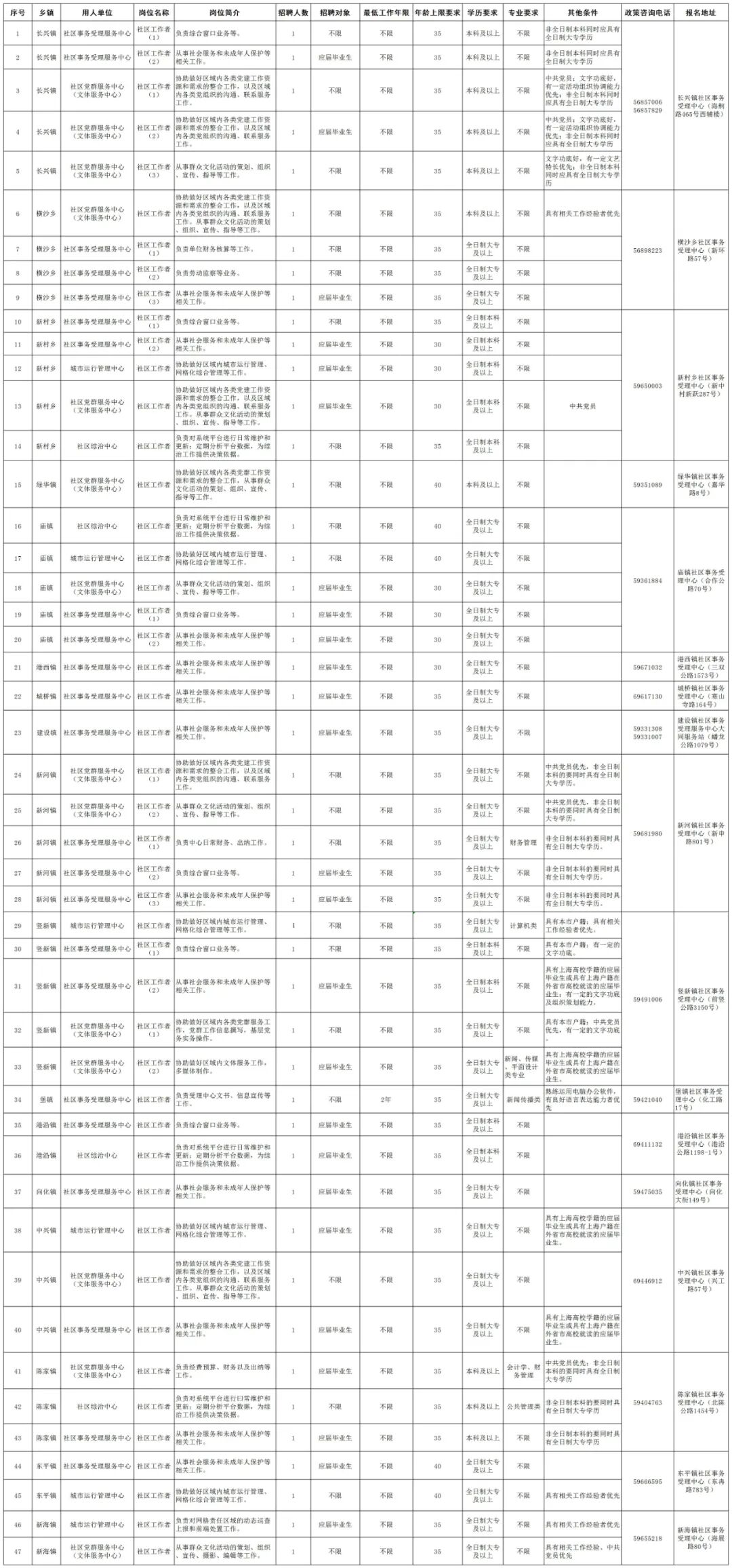 各招聘岗位具体要求及资格条件详见《崇明区2022年社区工作者公开招聘简章》(见附件)。